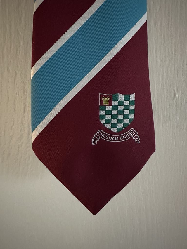 Elevate your formal attire with our Claret & Blue tie featuring a stitched Chesham United crest. Made from high-quality polyester, this standard-sized neckwear accessory is perfect for adding a fashionable touch to any outfit. The classic patterned design lends a sophisticated charm, making it an ideal choice for weddings, parties, or business meetings. Stand out from the crowd and show off your impeccable style with this versatile and stylish dress tie.